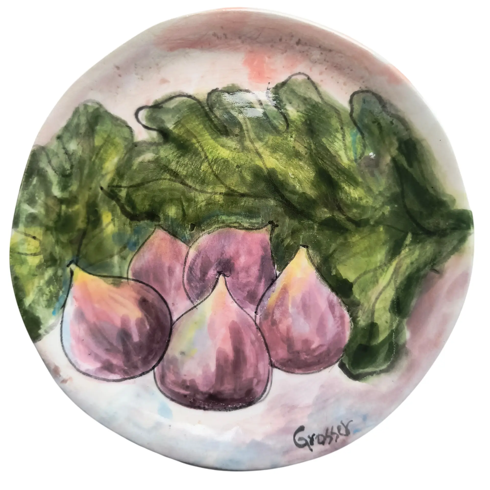 Hermoso Plato decorativo de cerámica, pintado a mano con higos de verano. 20 cm de diámetro , listo para colgar porque viene con gancho incorporado.